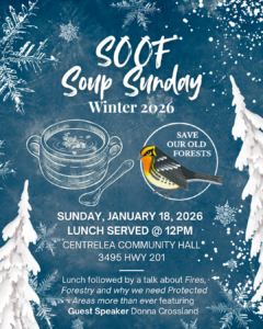 Join SOOF on Sunday, January 18, for a free lunch of soup, bread, sweets and tea and coffee! Doors open and lunch is served starting at 12 pm. Shortly after 1pm, Guest Speaker Donna Crossland will lead a conversation about “Fires, Forestry and why we need Protected Areas more than ever”. Donna will be joined by Nina Newington, who will provide a short update about Camp NOW for those that are curious!