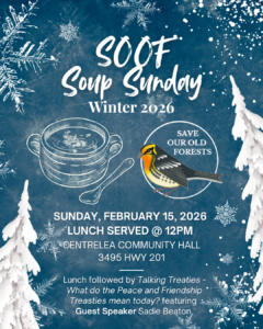 Join Save Our Old Forests at the Centrelea Community Hall (3495 Highway 201) for our February SOOF Soup Sunday! Doors open and lunch is served starting at 12 pm. Shortly after 1pm, Guest Speaker Sadie Beaton will facilitate a conversation about what the Treaties of Peace and Friendship mean today.