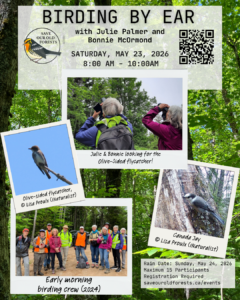 Save Our Old Forests is excited to get back out into the woods for an early morning Birding By Ear workshop with guest hosts Julie Palmer and Bonnie McOrmond. The last time Julie and Bonnie took a group through the forests of the Goldsmith Lake Wilderness Area participants were delighted to hear the “Quick Free Beer!” call of the Species-At-Risk Olive-sided flycatcher. What might we hear this time? The only way to find out is to register for the workshop.