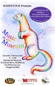 Save Our Old Forests (SOOF) is excited to invite you to our first concert of 2026: Music at the Museum!  We hope you can join us for an afternoon of uplifting harmonies and joyful instrumentals featuring performances from Still River, Lorne Allan & Sue Littleton, and Permanent Resonance.  Tickets are Pay What You Can (suggested $20) at the door.  Doors open at 1:30pm and music starts at 2pm.  Macdonald Museum (21 School Street, Middleton).
