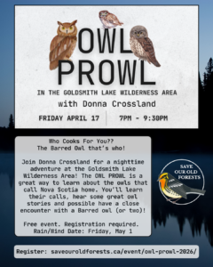 Join Donna Crossland for a nighttime adventure at the Goldsmith Lake Wilderness Area. The OWL PROWL is a great way to learn about the owls that call Nova Scotia home. You’ll learn their calls, hear some great owl stories and possible have a close encounter with a Barred owl (or two)!