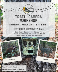 SOOF is excited to host Guest Speaker Bev Wigney for a hands-on trail camera workshop. Bev has been using trail cams around her property at Round Hil for the past several years to document the wildlife passing through. Her recent exhibit ReWild: The Art & Science featured artwork and video clips from the trail cameras. In this workshop Bev will share her tips and tricks for getting the best results from your trail camera – including camera settings and best placement.