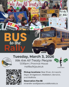 Want to join the “We Are All Treaty People Rally” on Tuesday, March 3, 2026 in Halifax/Kjiputkuk? Why not save yourself the drive from Annapolis County, Berwick and Wolfville and book a seat on the SOOF Rally Bus? Whether or not you can attend the please share the We Are All Treaty People Rally Facebook Event and invite your friends!